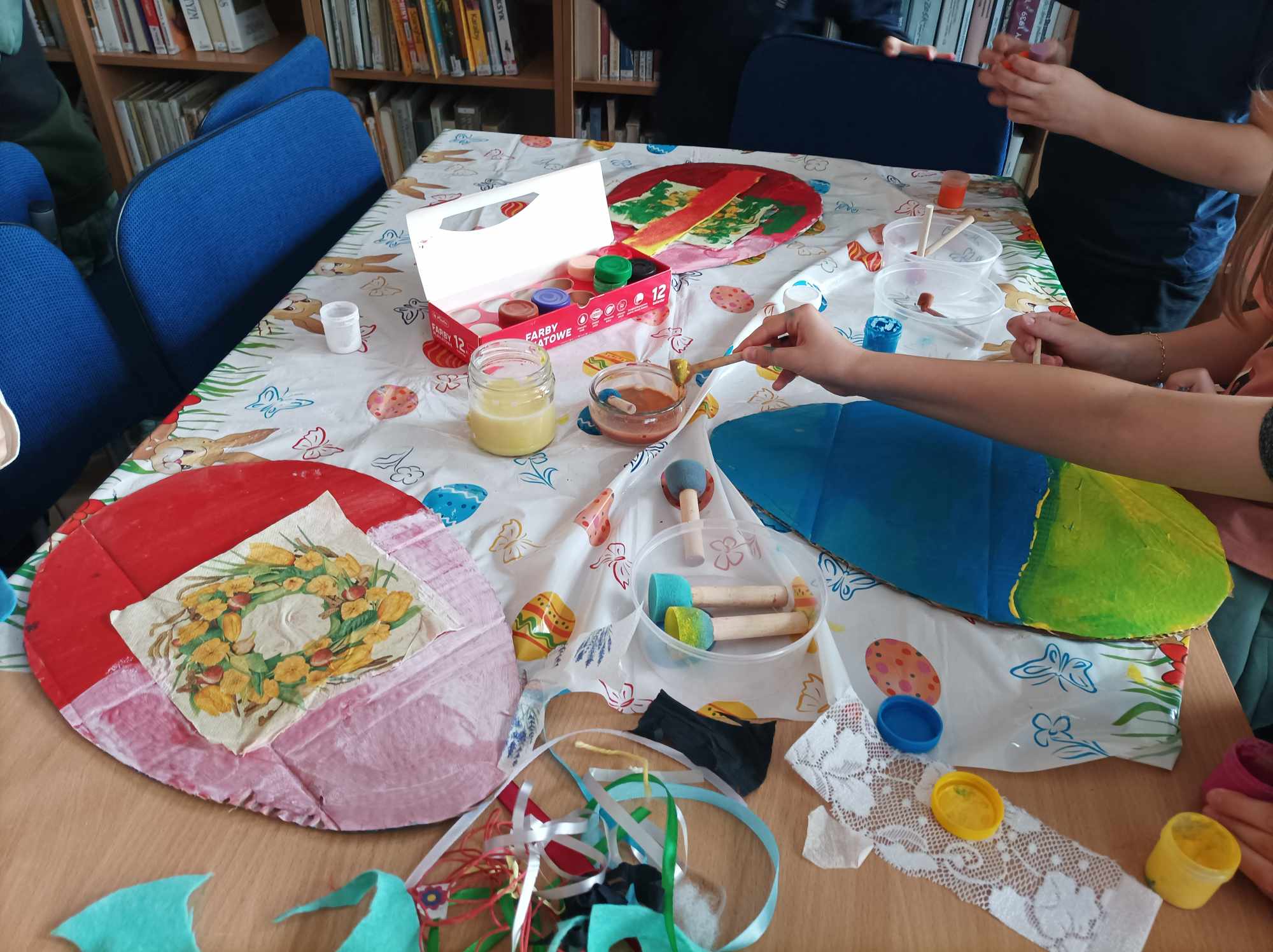 Dzieci wykonały także prace plastyczne: kurki złotopiórki, kartonowe pisanki w rozmiarze XXXL i pisanki z papieru.