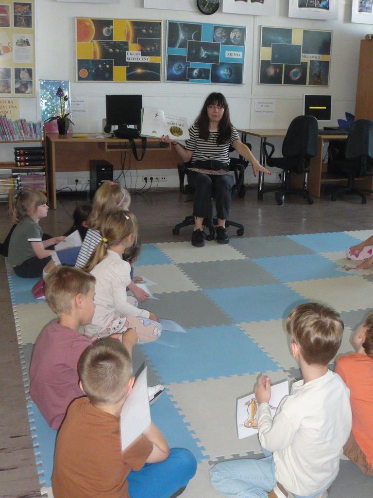 W piątkowy poranek 17 maja 2024 r. do Biblioteki dla Dzieci i Młodzieży nr 65 z wizytą przybył tajemniczy Stworek zwany Gruffalo ze swoją towarzyszką myszką. Zjawił się u nas dzięki p. Karolinie – lektorce ze szkoły językowej Early Stage, która gości u nas w ramach projektu „Czytanie na dywanie”.