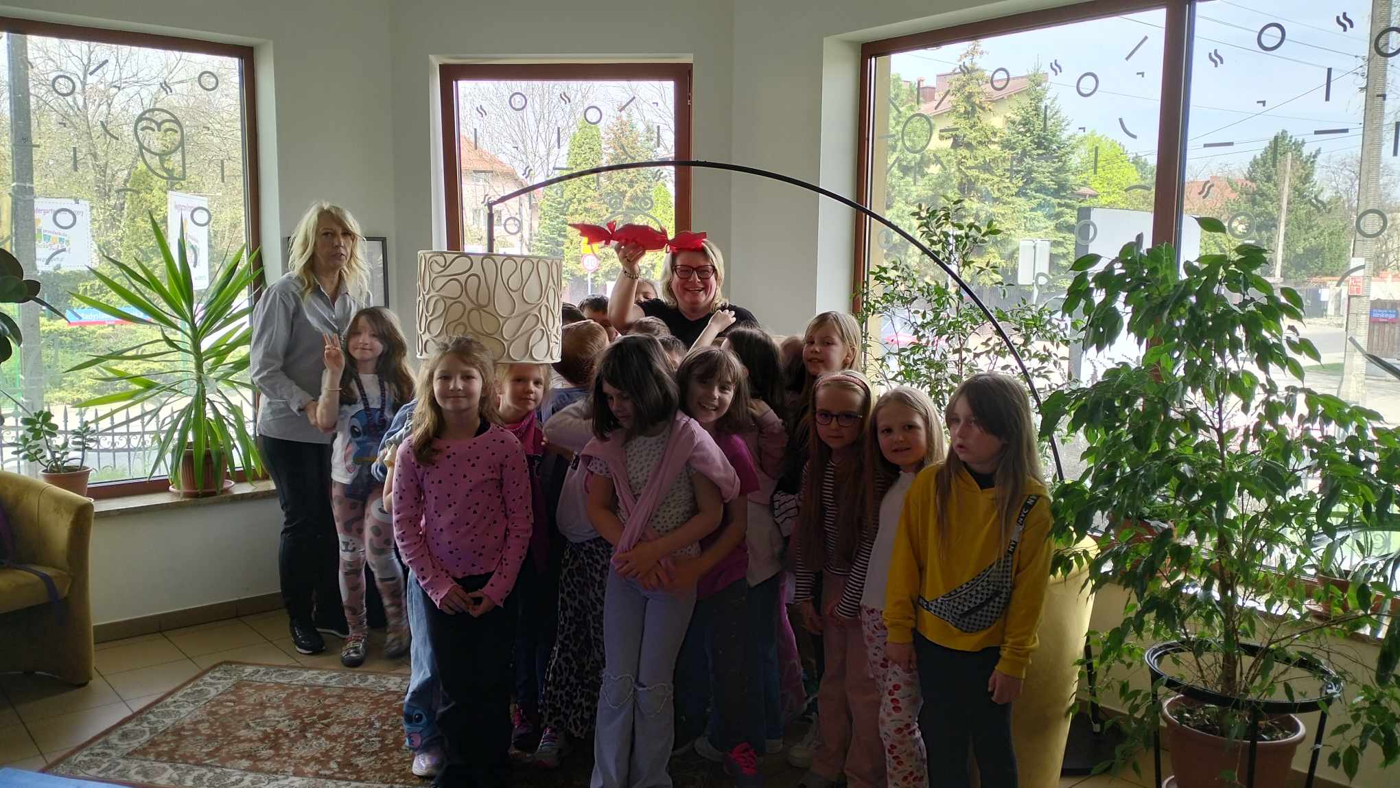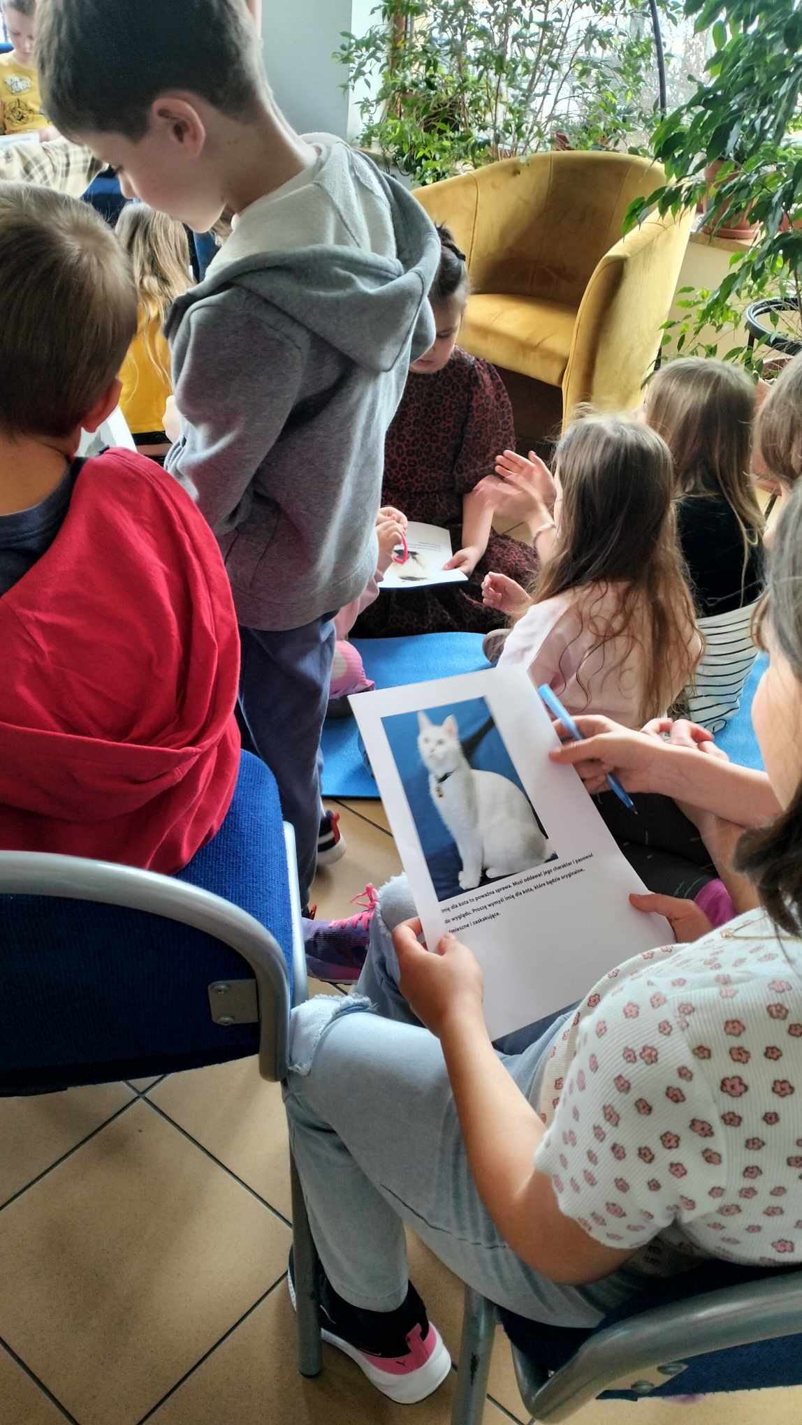 W drugiej części dzieci w grupach rozwiązywały krótki test z wiedzy o lekturze i dostały zadanie, aby napisać nietypowe imię dla kota na ilustracji, np. jakieś śmieszne, zaskakujące, przewrotne, a zarazem oryginalne i pomysłowe. Wszystkie grupy zaliczyły zadanie z doskonałym wynikiem, a emocje, jakie towarzyszyły przy rywalizacji, widoczne są na zdjęciach. Na koniec spotkania w nagrodę uczniowie dostali słodką niespodziankę – dużego czerwonego cukierka.