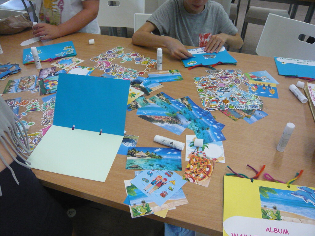 Kolejne spotkanie miało charakter warsztatów plastycznych, podczas których powstały wakacyjne albumy – pełne kolorów, wspomnień i kreatywnych pomysłów. Podczas pracy twórczej uczestnicy opowiadali i prezentowali swoje pamiątki z podróży, dzielili się historiami i inspiracjami, tworząc atmosferę pełną radości i letniego klimatu. To były bardzo udane spotkania.