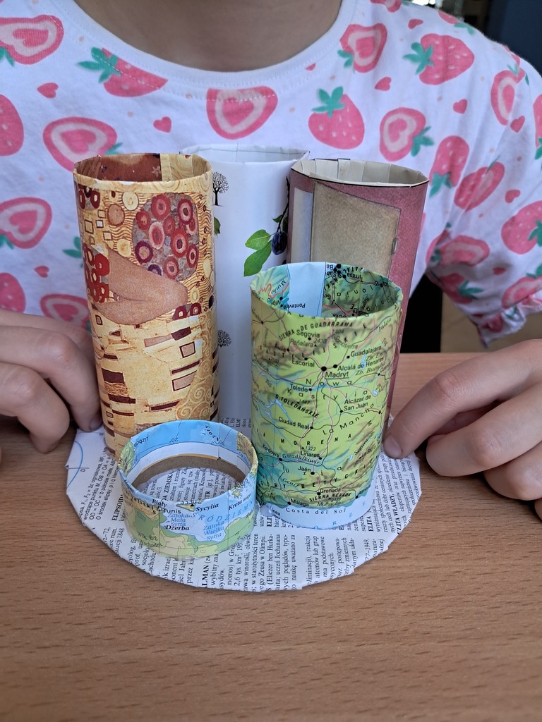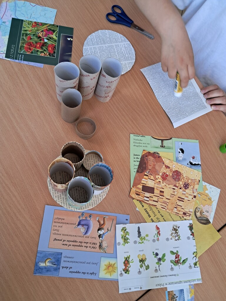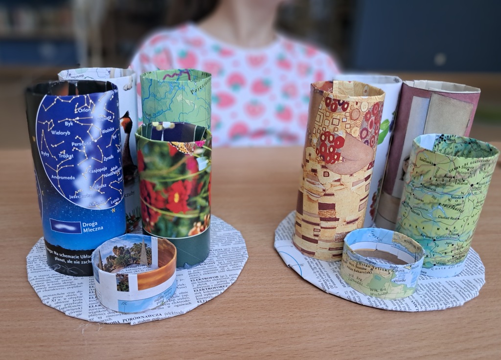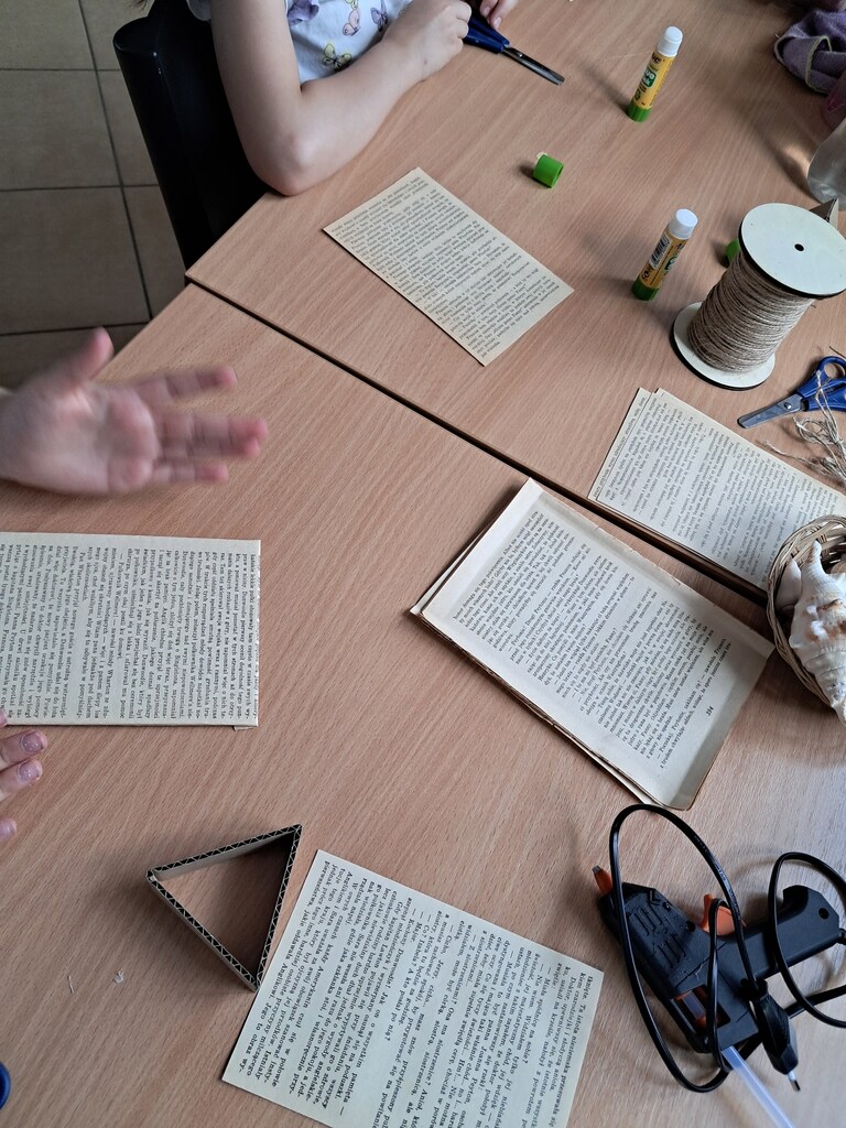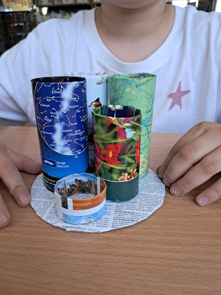 4 i 7 lipca w Wypożyczalni nr 2 kontynuowaliśmy twórczą podróż z ekologicznym przesłaniem. Były to dodatkowe zajęcia, o które poprosiły dzieci, co pokazuje, że połączenie kreatywności z ekologicznym podejściem jest dla nich inspirujące i atrakcyjne. Zainspirowane ideą drugiego życia książki, dzieci stworzyły organizery na biurko (4 lipca) i niepowtarzalne ramki na zdjęcia (7 lipca) – wszystko z materiałów z recyklingu. Wykorzystano m.in. tekturę, stare książki, pamiątkowe muszelki, sznurek, a także rolki po papierze toaletowym. Radość uczestników z tworzenia pokazała, że ekologiczne podejście może być świetną zabawą.