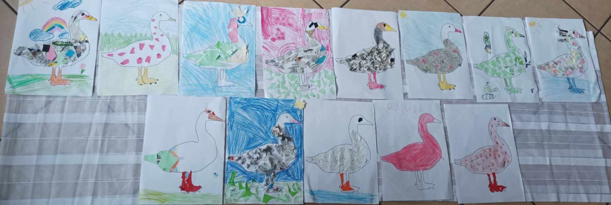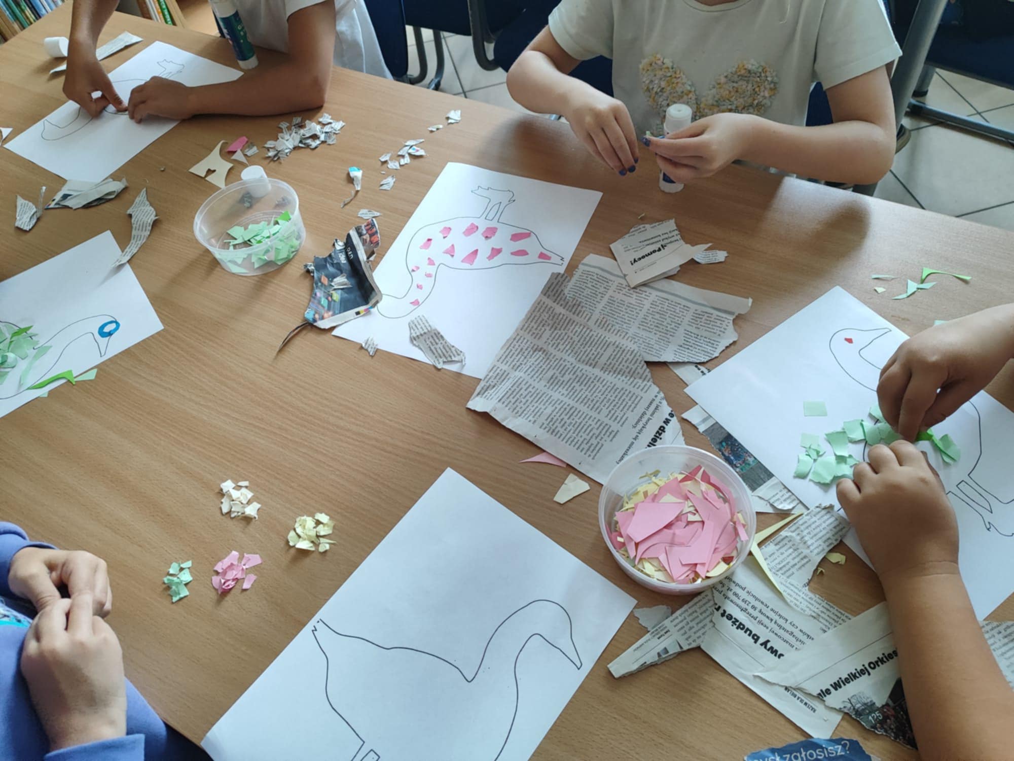 Temat „Ptaki – współczesne dinozaury” umożliwiał poznanie ciekawych i osobliwych gatunków ptaków zamieszkujących różne miejsca na świecie. W kąciku plastycznym dzieci wyklejały ptaka, a robiły to, wykorzystując resztki gazet i kolorowego papieru. Ptaki prezentowały się bardzo kolorowo i wesoło.