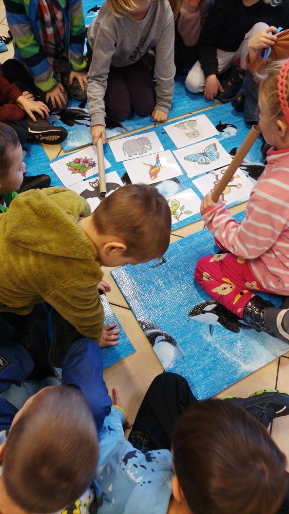 Zajęcia prowadzone przez Pana Macieja rozpoczęły się od zapoznania nauczyciela z dziećmi. Maluchy brały udział w wielu zabawach ruchowych, podczas których uczyły się nazw zwierząt mieszkających w dżungli. Pięciolatki utrwalały sobie słownictwo dzięki różnorodnym aktywnościom umysłowym, np. grze memo. Pan Maciej przy muzyce dżungli, która wybrzmiewała w tle, przeczytał dzieciom zabawną, mądrą i ciekawą książeczkę Julii Donaldson pt. „Monkey Puzzle”. Na zakończenie spotkania mali uczestnicy zajęć otrzymali naklejkę przedstawiającą zwierzątko.