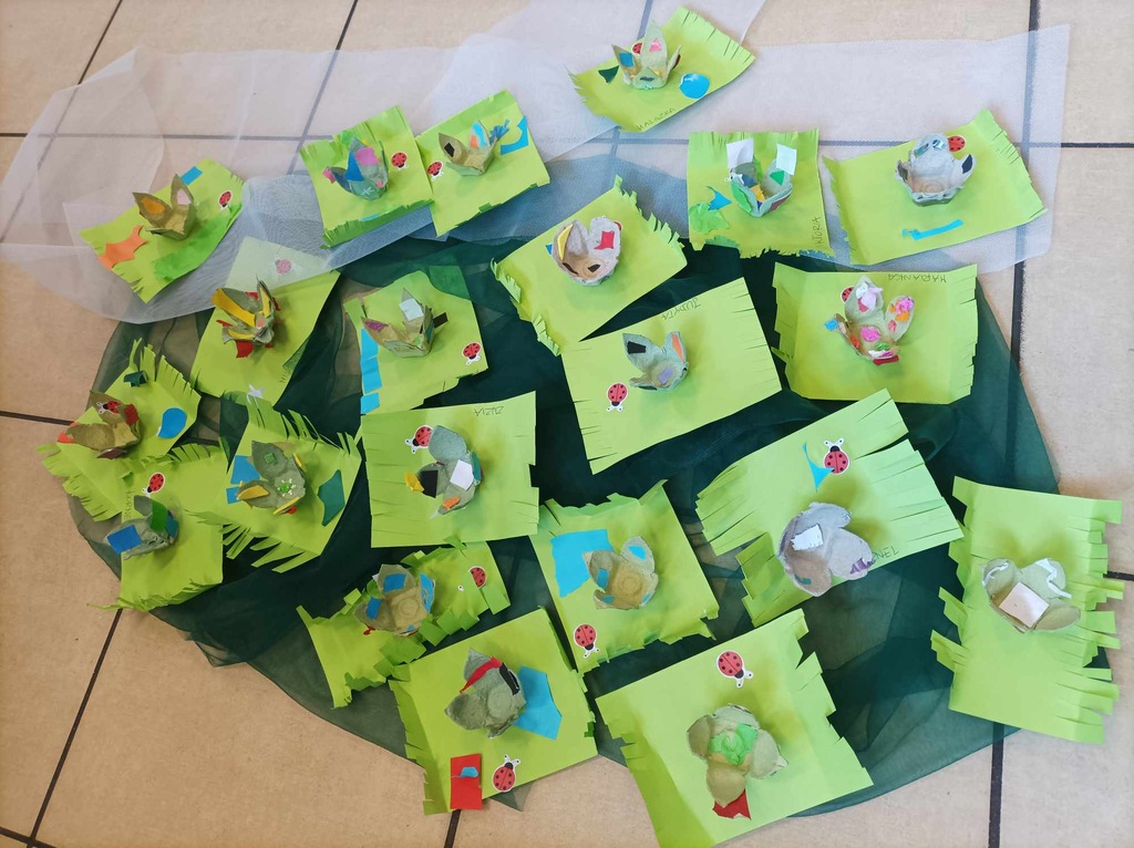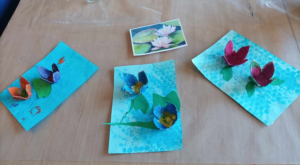 Uczniowie wykonali swoje własne nenufary unoszące się na tafli wodnej. Zostały one wykonane z materiału recyklingowego – wytłaczanki po jajkach.