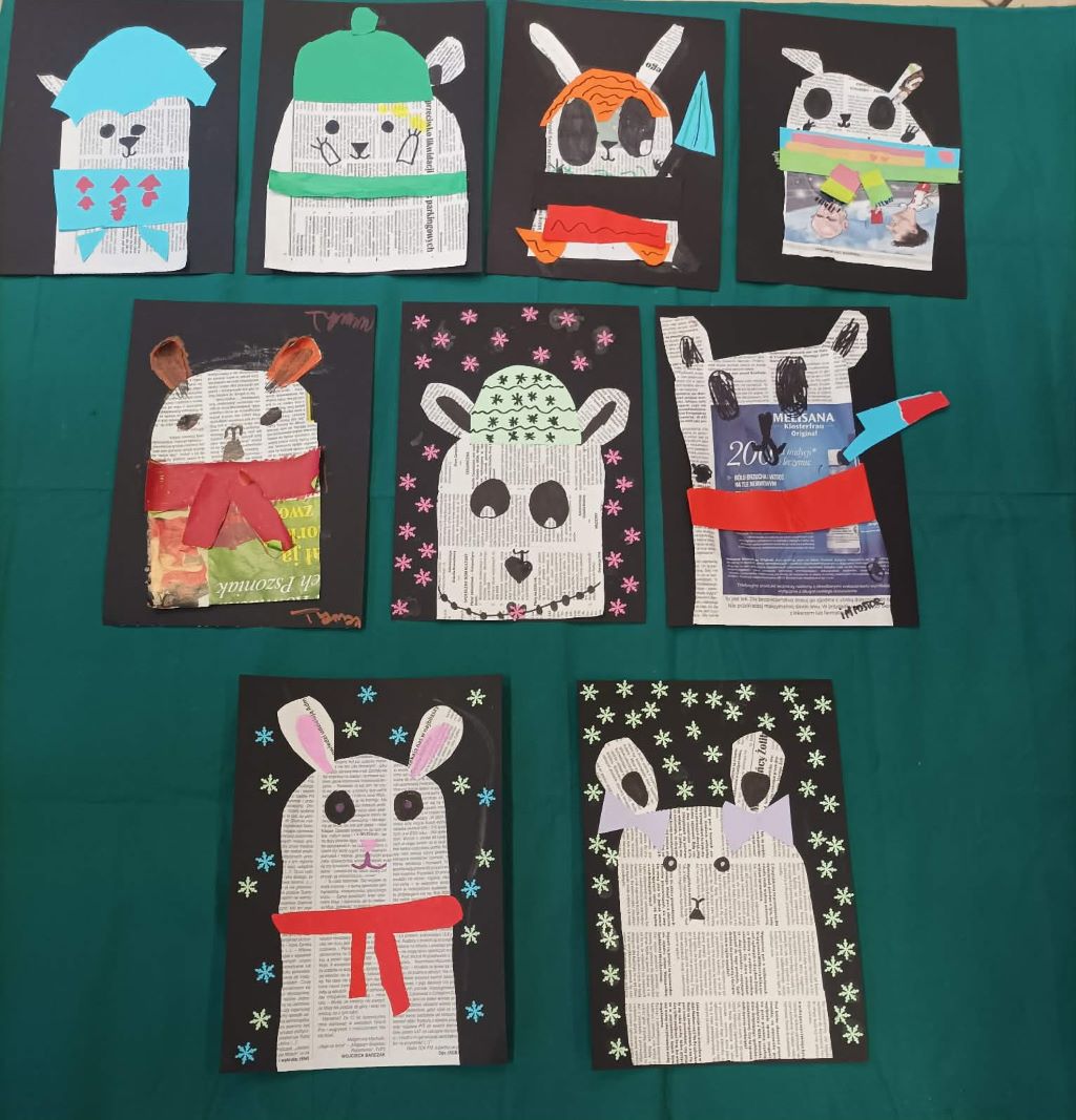 W kąciku plastycznym powstały zimowe, polarne misie z gazety i kolorowego papieru oraz bałwanki obsypane srebrzystym śniegiem i bałwanki wypełnione puszystą watą.