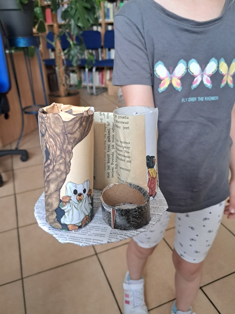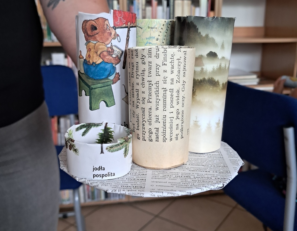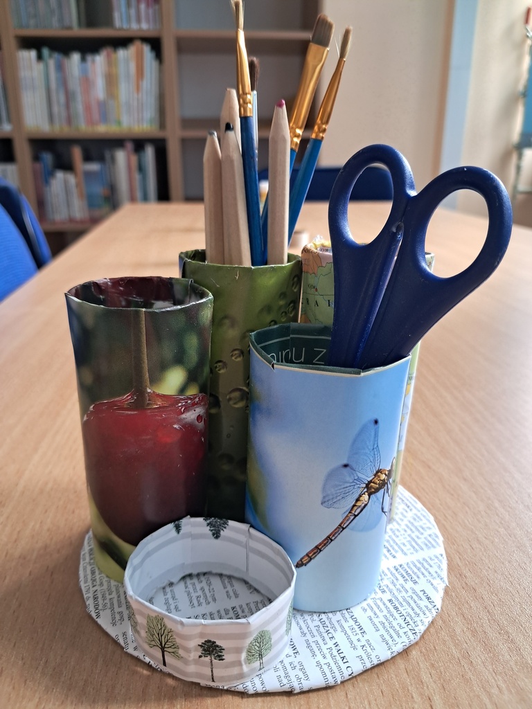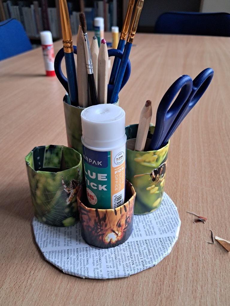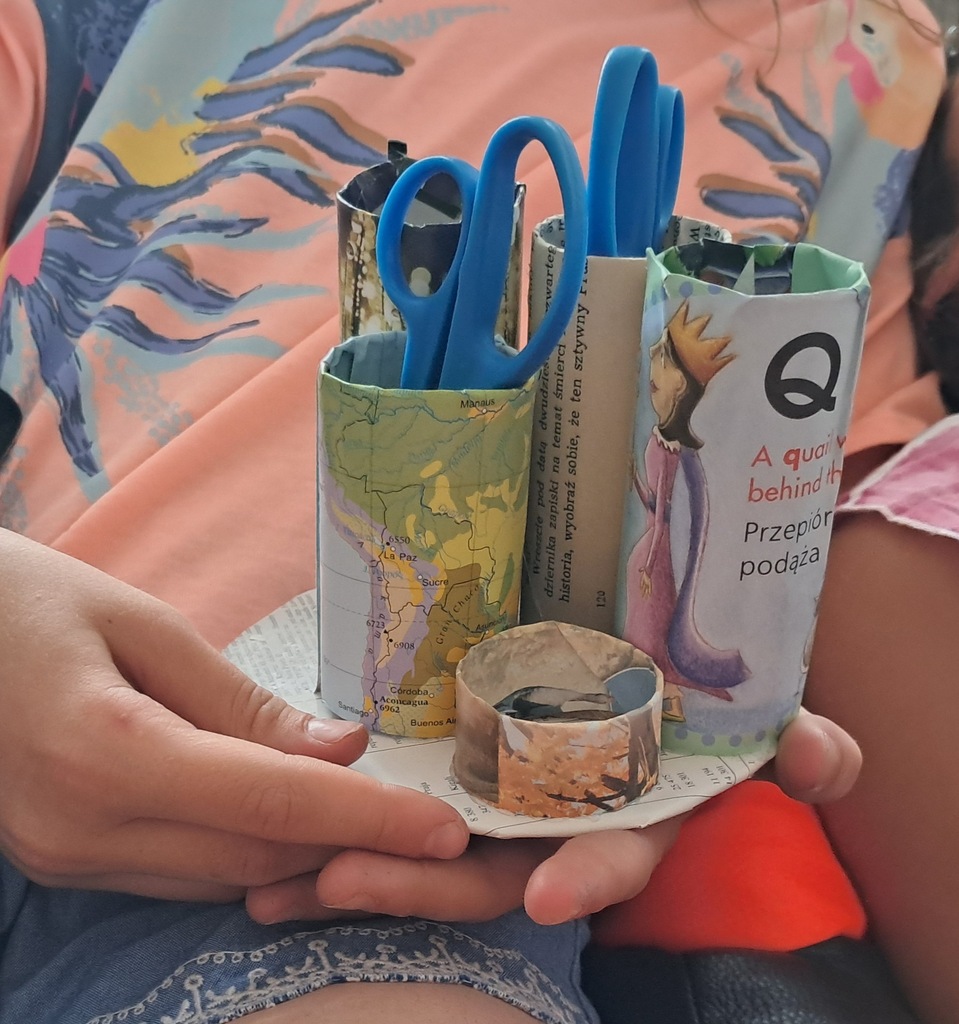 W części warsztatowej dzieci wykorzystały tekturę, rolki po papierze toaletowym oraz stare książki, tworząc oryginalne organizery na biurko. Proces twórczy pełen był radości, kreatywności i współpracy. Uczestnicy z zaangażowaniem pracowali nad swoimi projektami, dając drugie życie przedmiotom, które mogłyby trafić na śmietnik.