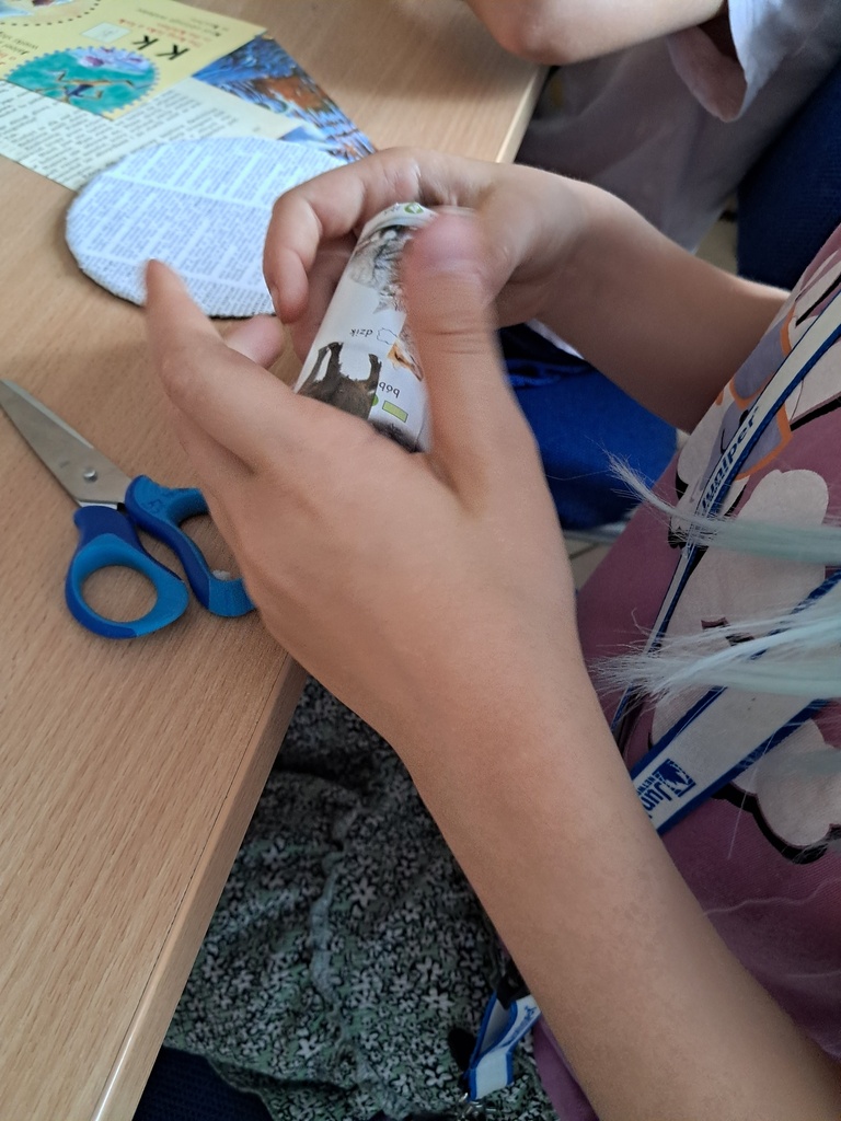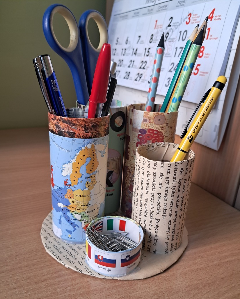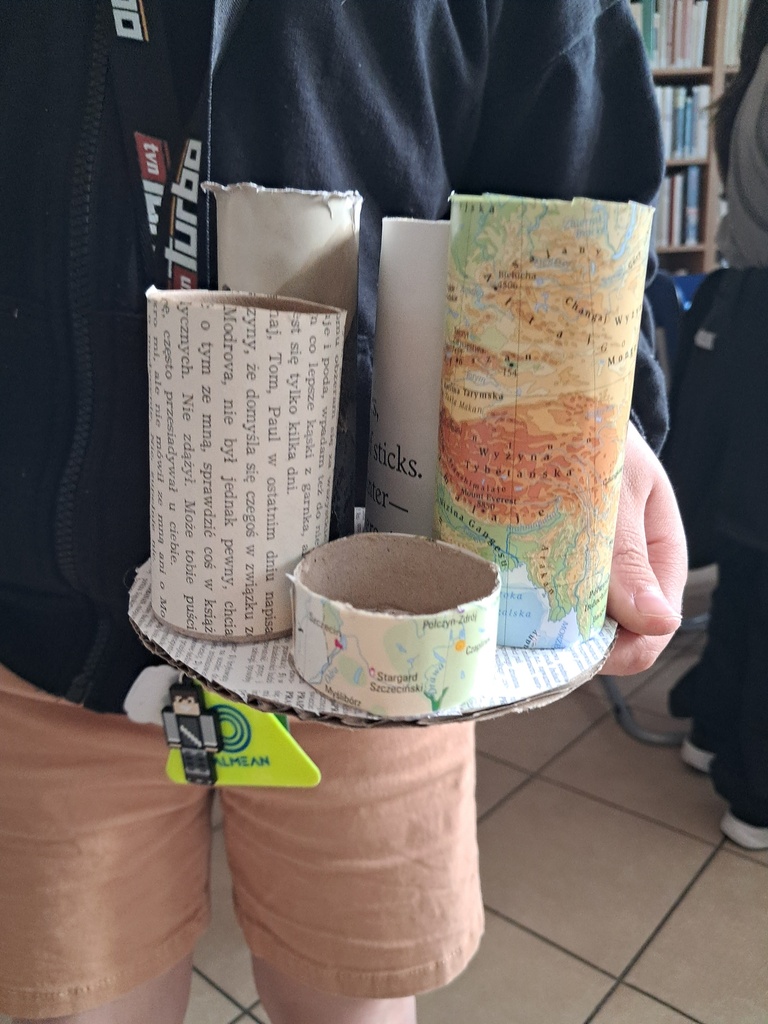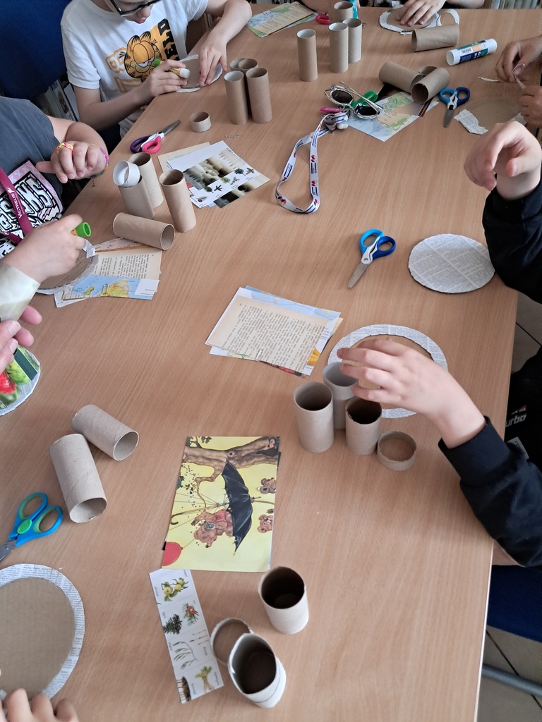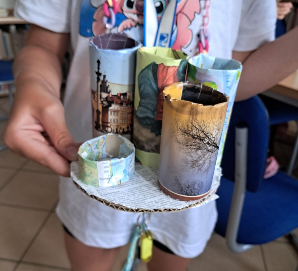 W części warsztatowej dzieci wykorzystały tekturę, rolki po papierze toaletowym oraz stare książki, tworząc oryginalne organizery na biurko. Proces twórczy pełen był radości, kreatywności i współpracy. Uczestnicy z zaangażowaniem pracowali nad swoimi projektami, dając drugie życie przedmiotom, które mogłyby trafić na śmietnik.