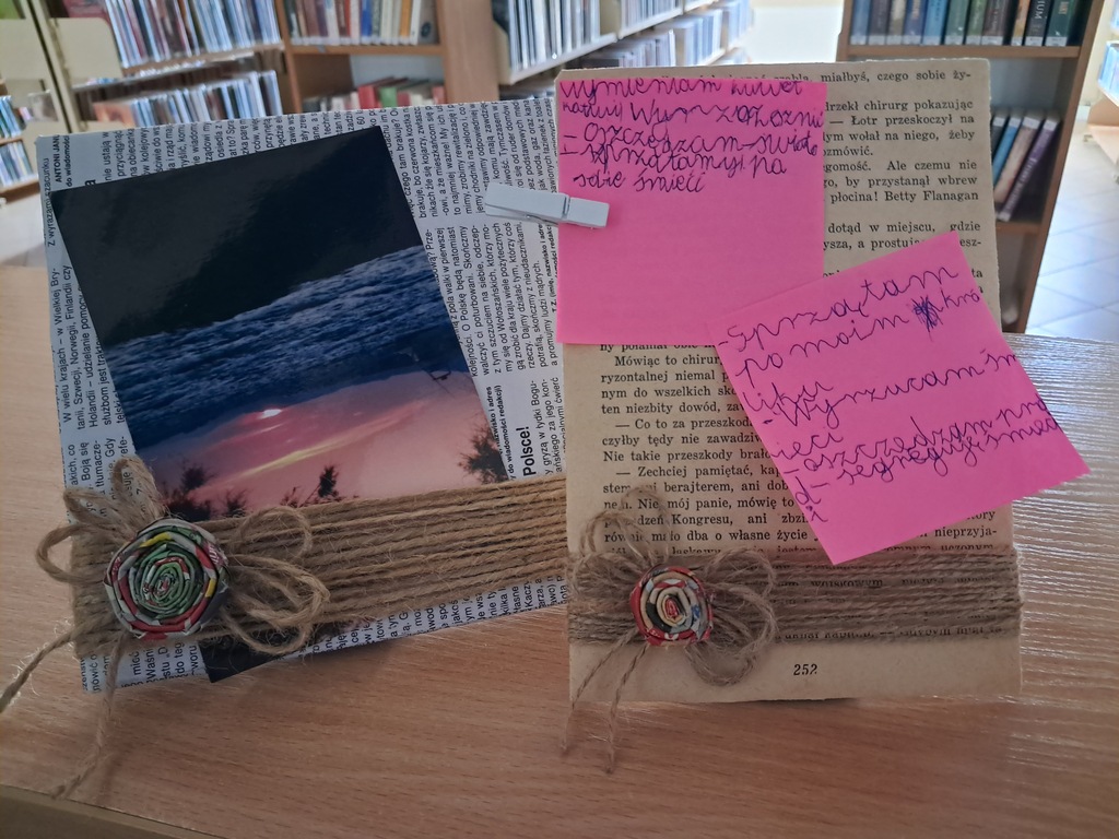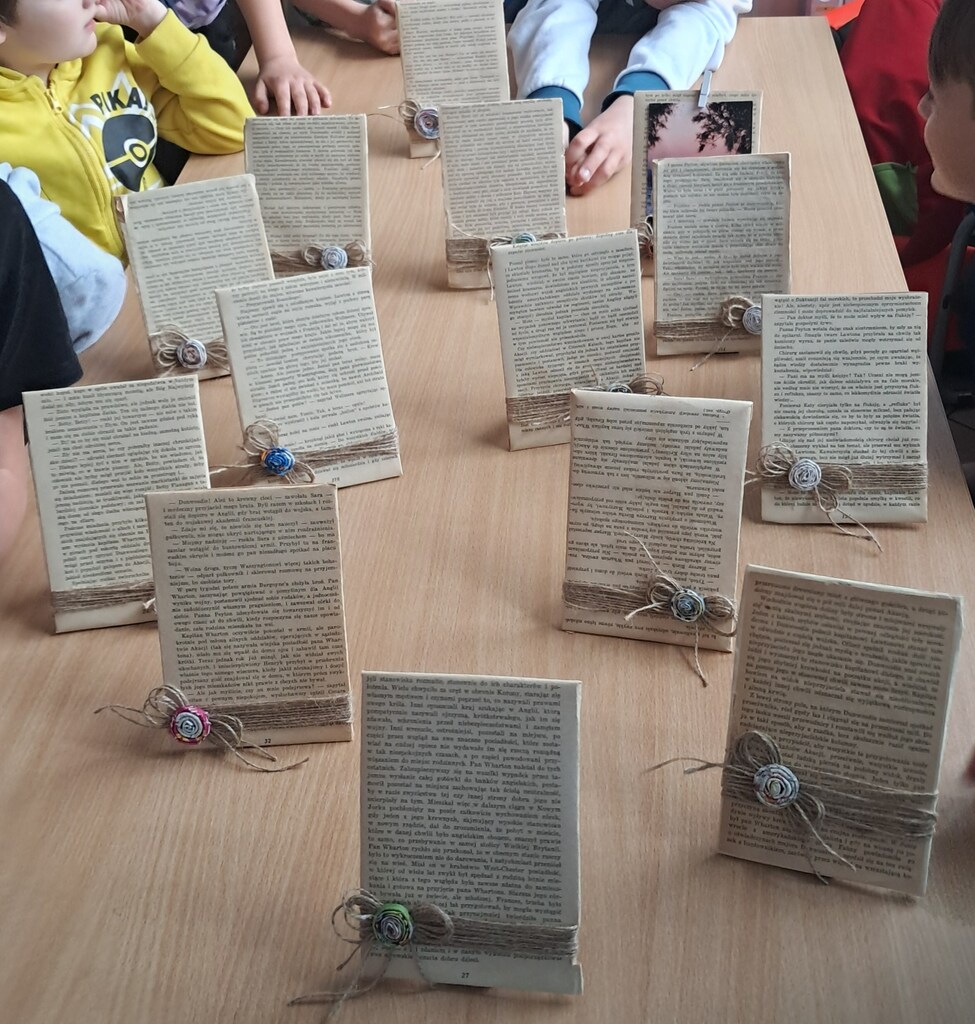 Po literackim wprowadzeniu dzieci przystąpiły do części plastycznej – samodzielnie tworzyły ramki na zdjęcia, które mogą pełnić również funkcję tablic organizacyjnych. Materiały użyte do ich stworzenia – tektura, stare książki, wiklinowe elementy skręcone z gazet oraz sznurek – stały się dowodem na to, że przedmioty codziennego użytku mogą otrzymać drugie życie i służyć w nowej, ekologicznej formie.