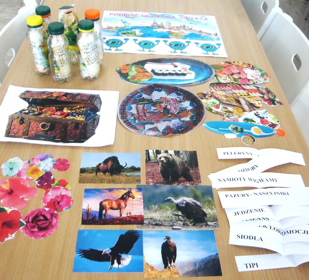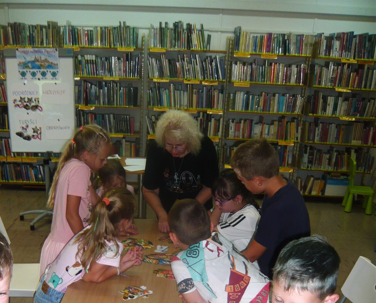Doskonała zabawa towarzyszyła nam na wszystkich zajęciach. Dużym zainteresowaniem cieszyła się wyprawa „Fantastyczna podróż dookoła świata”. Odbyliśmy wspaniałą, pełną przygód wycieczkę, zarówno w czasie, jak i w przestrzeni. Spotkania były rodzajem gry bibliotecznej, w której uczestnicy poznali ciekawe miejsca pod względem walorów turystycznych, a także obyczaje, historię i geografię tych miejsc. Zabawie towarzyszyła rywalizacja w grupach podczas wykonywania inspirujących zadań. Należały do nich: szukanie skarbu piratów na Karaibach, zwiedzanie Dzikiego Zachodu, olimpiada słowna w Grecji, poszukiwania zaginionej Atlantydy i przygotowanie japońskiego śniadania długowieczności. Przy okazji odwiedzaliśmy także Hawaje i indiańską wioskę. Nasi goście doskonale radzili sobie ze wszystkimi poleceniami. Zajęciom towarzyszyły prezentacje audiowizualne i rozgrywki manualne. Barwne podróże po świecie uświadomiły nam, jak wiele jest wspaniałych i tajemniczych krain, które warto odwiedzić.