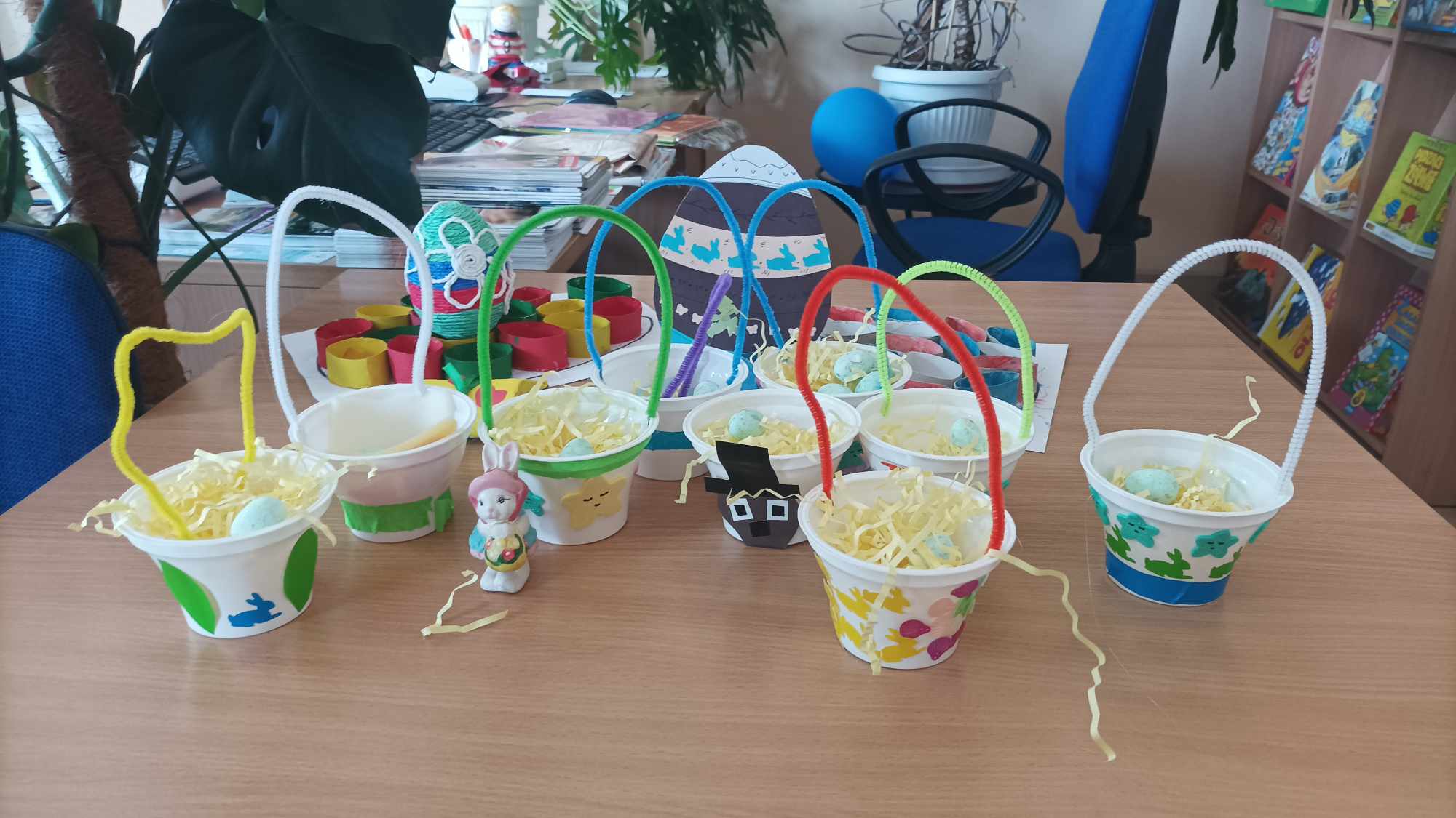 W tym roku na przełomie marca i kwietnia przypadała Wielkanoc. My także ją świętowaliśmy w naszej bibliotece. W wielkanocnym koszyczku (własnoręcznie zrobionym przez uczniów kl. VI ze Szkoły Wspierania Rozwoju przy ul. Toruńskiej 23) nie mogło oczywiście zabraknąć kolorowych, wesołych pisanek. Pojawiły się także żółte jak słońce koguty, białe i niebieski króliki oraz puchate baranki.