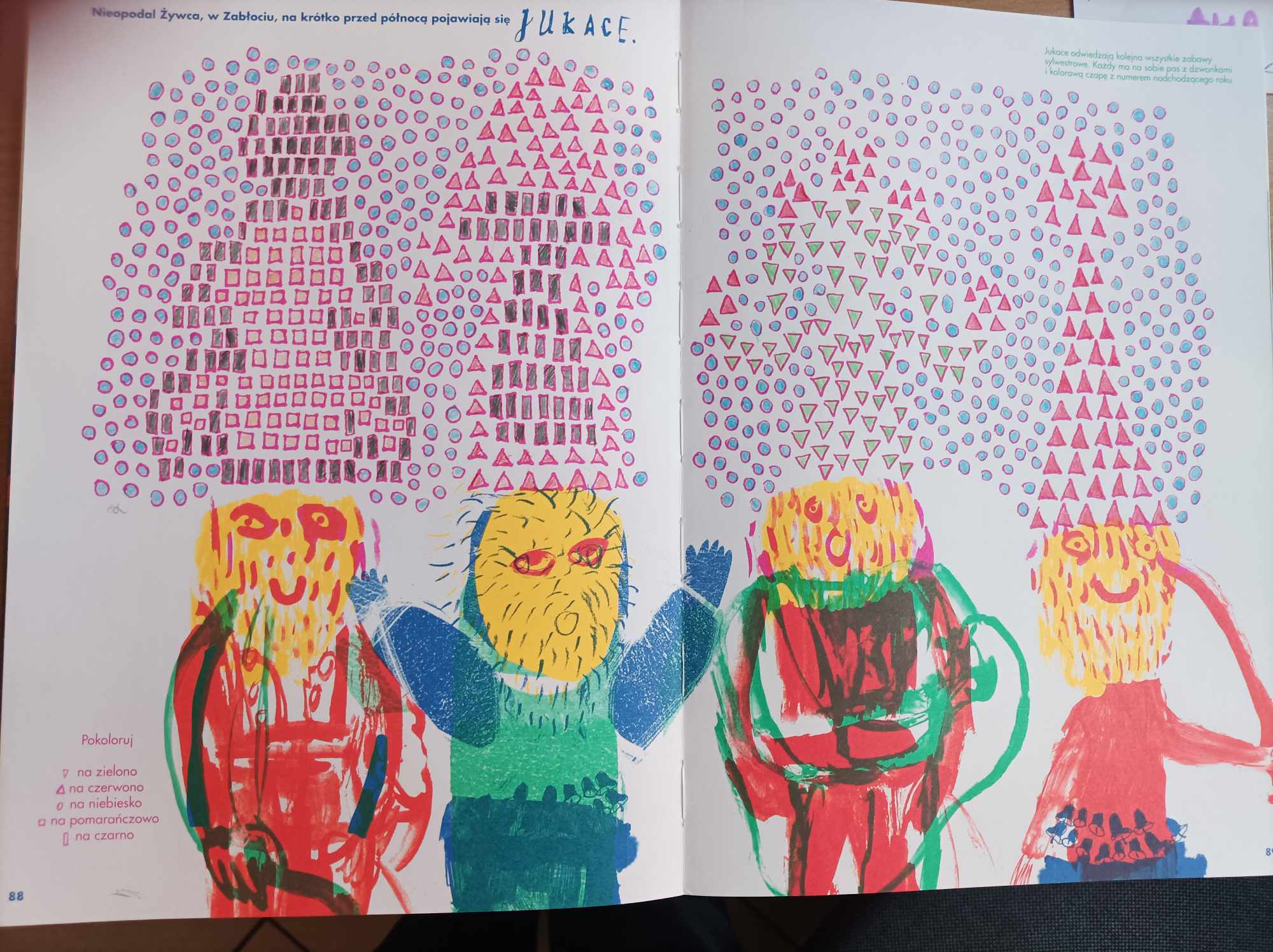 Sześciolatki miały do wykonania zadanie polegające na pokolorowaniu odpowiednimi kolorami figur geometrycznych znajdujących się na kartce. Wyłonili się z tego sylwestrowi kolędnicy z Zabłocia koło Żywca, tzw. Jukace (karta aktywnościowa pochodziła z książki A. Kaźmierak „Turonie, żandary, herody” o sztuce i kulturze ludowej).