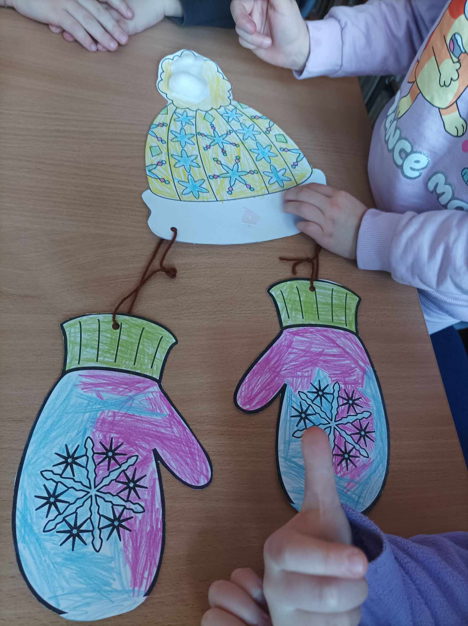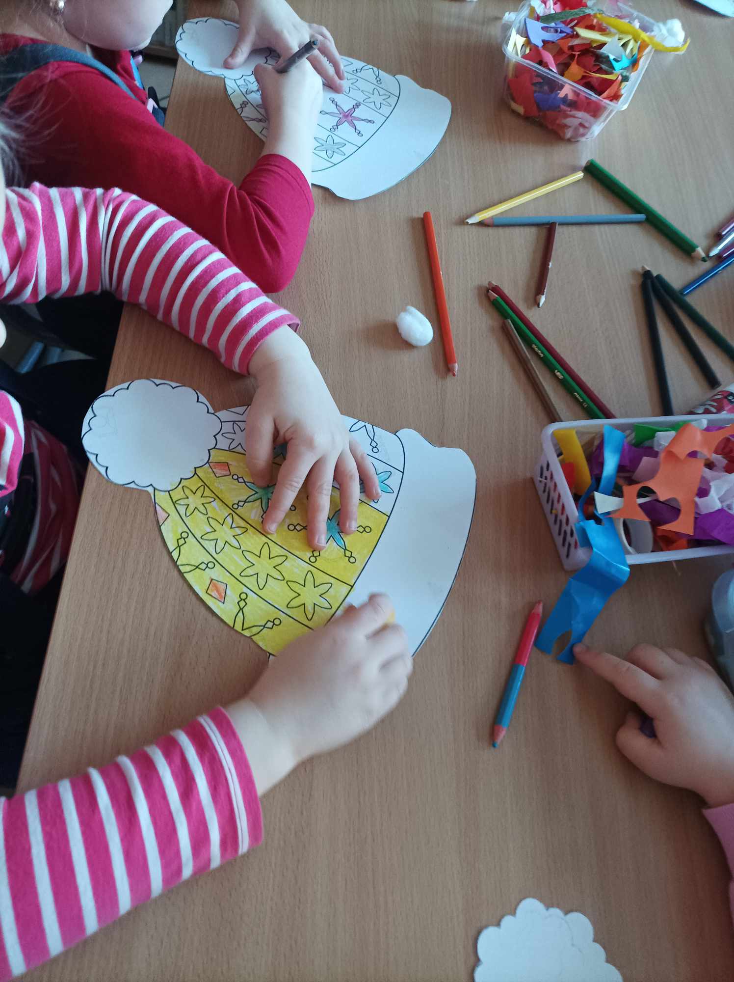 W części plastycznej spotkania dzieci wyklejały i kolorowały rękawiczki, które wraz z wcześniej ozdabianą czapeczką miały stanowić komplet zimowy, chroniący przed zimnem, a „podarowany” im przez dziadków.