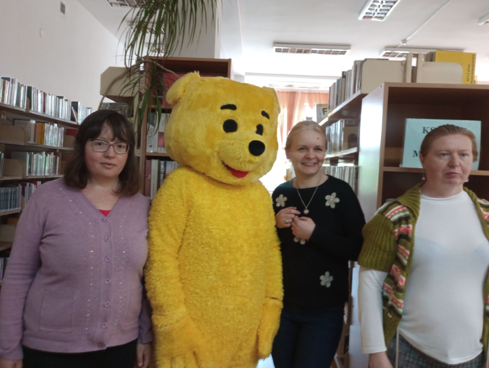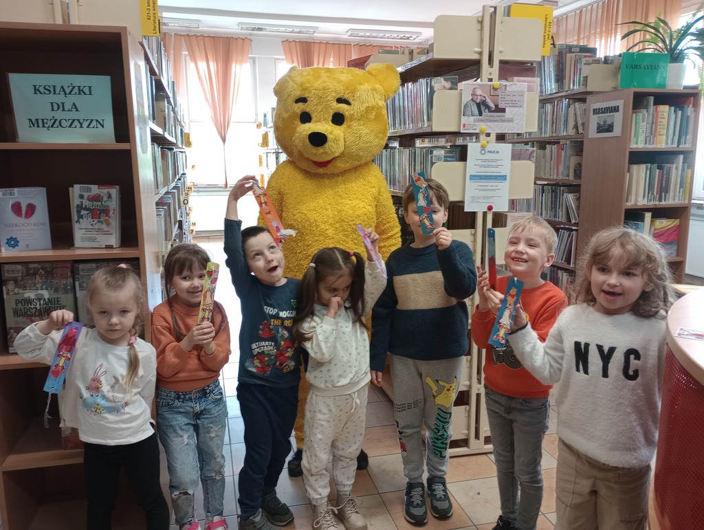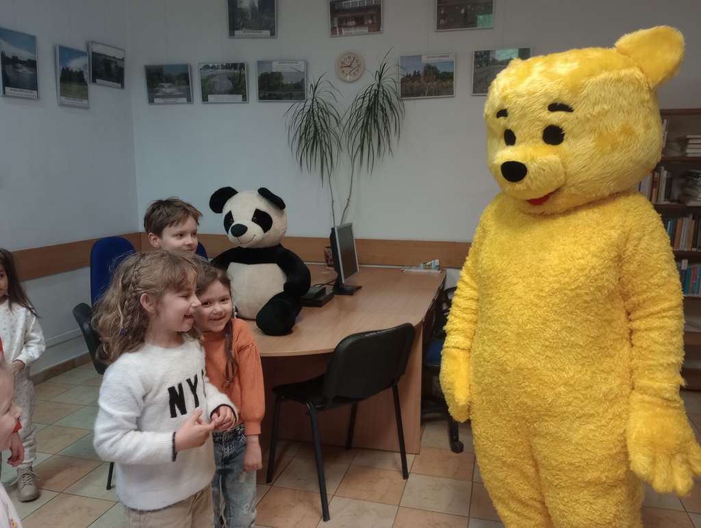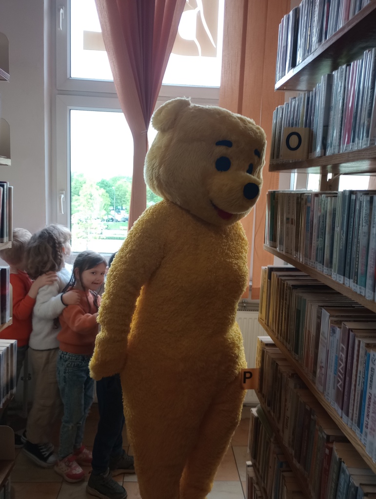 Na naszych małych gości czekała niespodzianka. Grzecznie zapukali do drzwi wypożyczalni i otworzył im… duży miś! Jakież było zaskoczenie i radość dzieci, że takie atrakcje mogą spotkać w bibliotece!