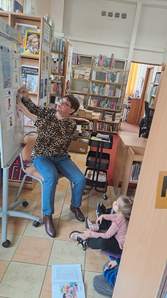 Ale to był dopiero początek niezwykłych wydarzeń, które dzieci miały za chwilę spotkać. Po powitaniu wszyscy grzecznie wsiedli do „pociągu” i wraz z misiem rozpoczęła się podróż po bibliotece, której stacją końcową były półki z literaturą dla najmłodszych. Następnie pani bibliotekarka opowiedziała dzieciom o Światowym Dniu Książki i praw autorskich, a także o zasadach, jakie panują w bibliotece. Przeczytała także fragmenty książek o Kubusiu Puchatku i Franklinie.