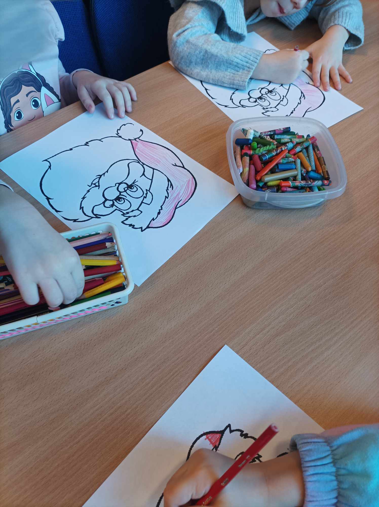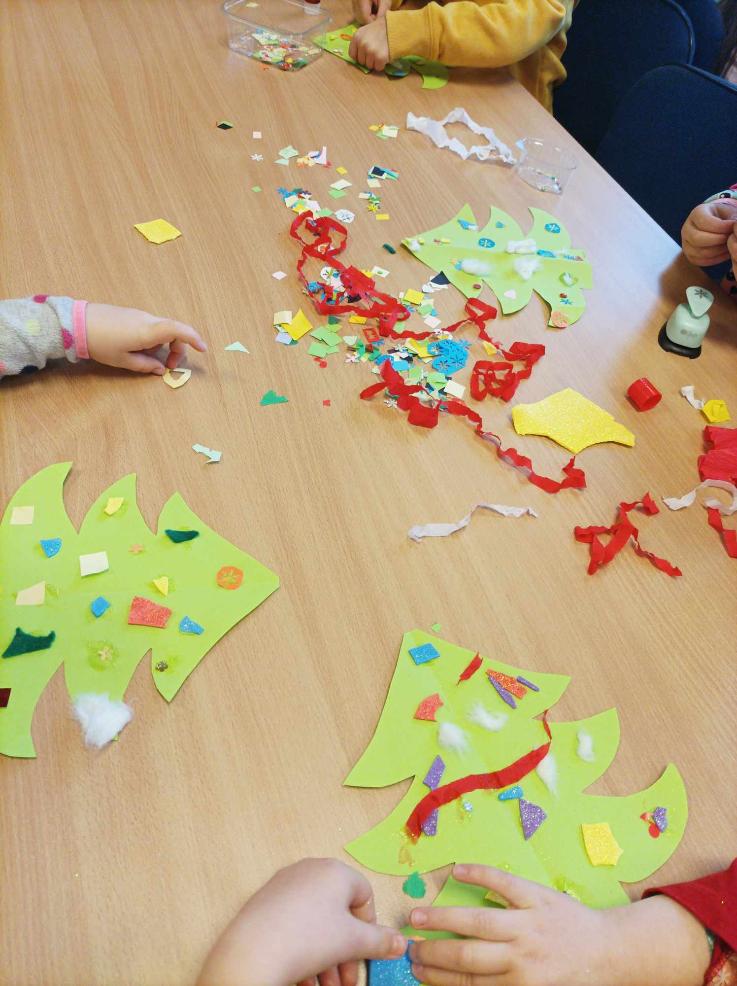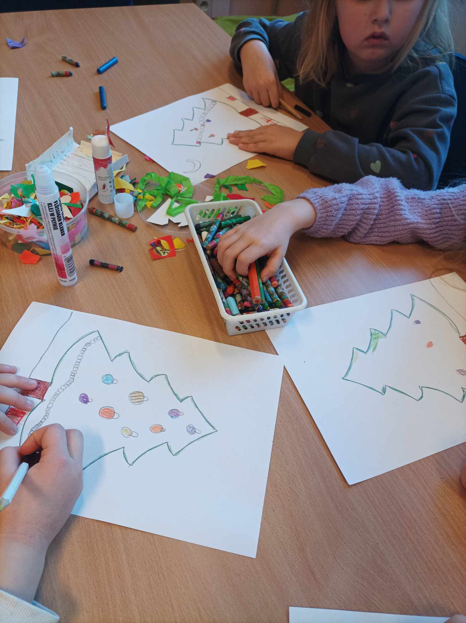 W świątecznych spotkaniach uczestniczyły również sześciolatki z grupy „Motylki” z Przedszkola „Pod Zielonym Listkiem”, które poznały „Pomocników Mikołaja” B. Timmsa i wykonały choinkę z kolorowych pasków papieru, której szczyt przyozdobiły świecącą gwiazdką.