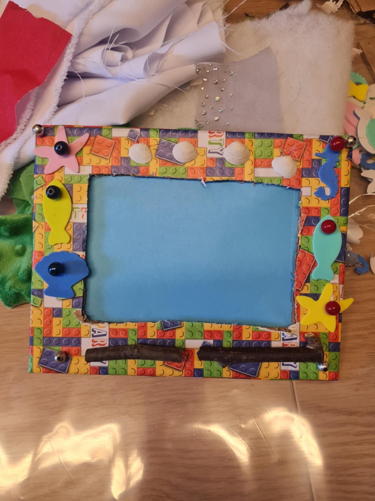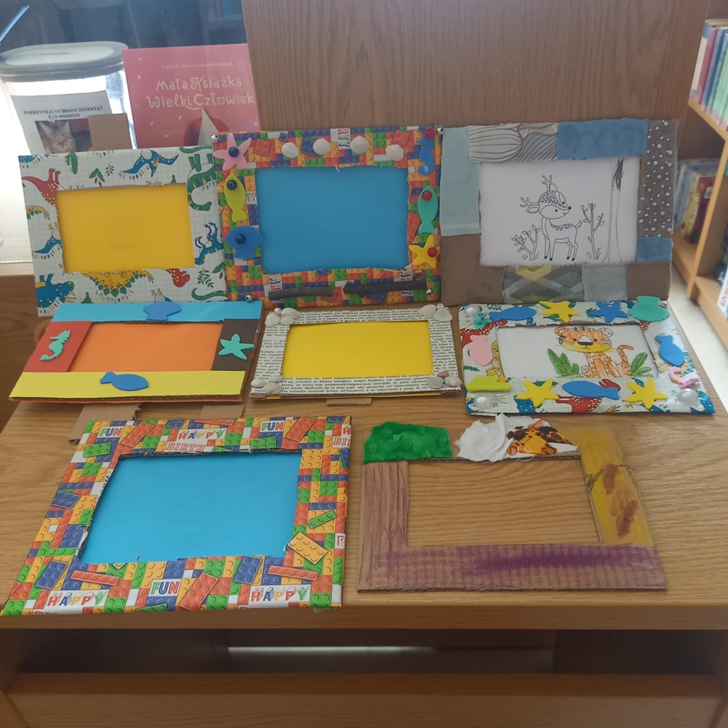 Wykorzystaliśmy w tym celu kawałki tektury, które zostały przyozdobione według własnych pomysłów. Kolorowy papier, skrawki materiałów, stare książki, muszelki znalezione nad morzem, kawałki kory i patyki – czyli wszystko, co wpadło nam w ręce – zostało wykorzystane do udekorowania ramek.