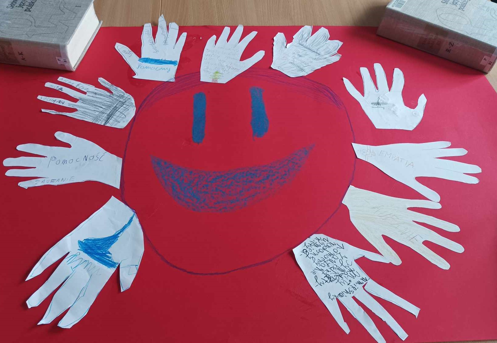 Uczniowie wykonali plakat odnoszący się do tematu zajęć. Na odrysowanej dłoni każdy uczestnik wypisał cechy, którymi powinien wyróżniać się przyjaciel. W ten sposób stworzyliśmy emotkę przyjaźni.