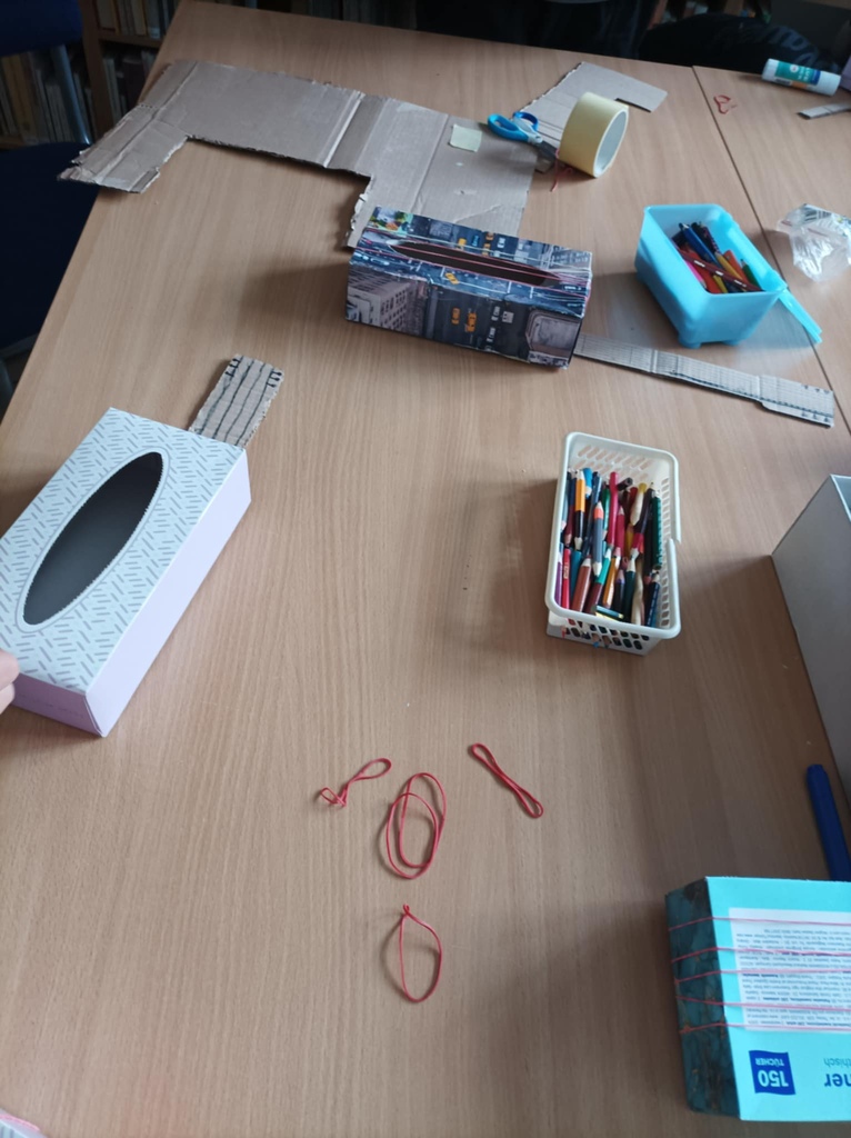 Na zakończenie spotkania nasi goście wykonali gitary z pudełek po chusteczkach higienicznych oraz zmierzyli się z jednym z zadań przygotowanych przez Annę Kaźmierak w książce „Turonie, żandary, herody”.