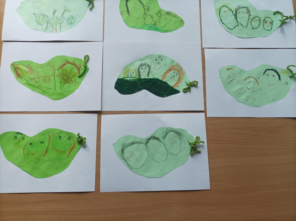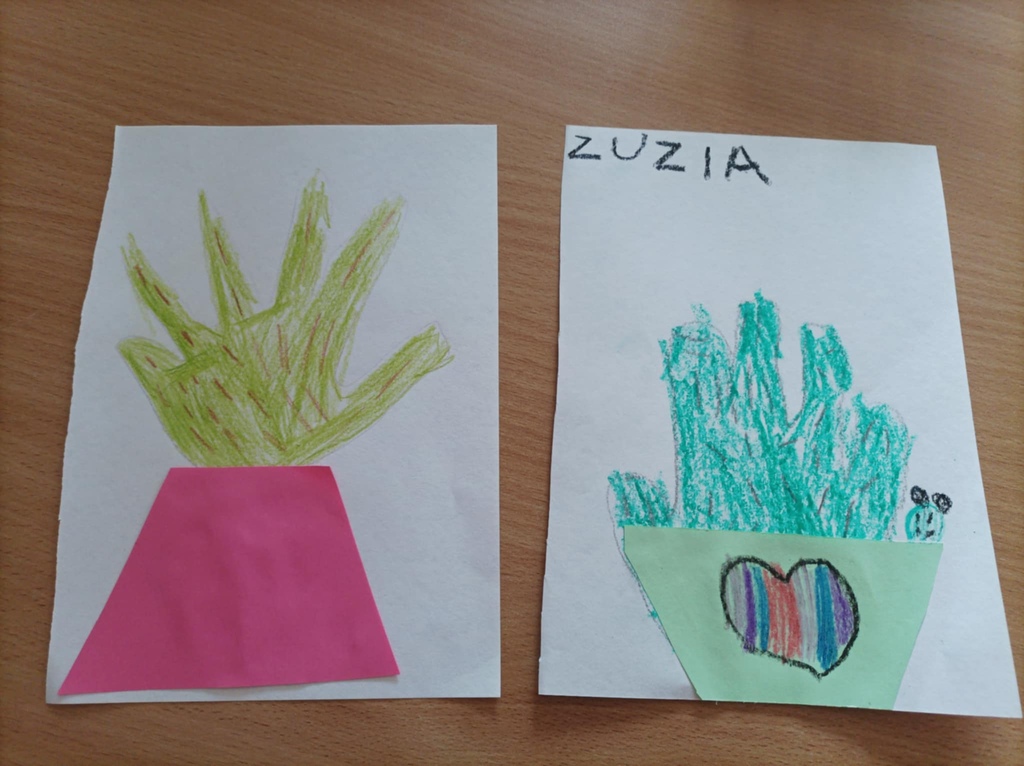 W kąciku twórczym dzieci wykonały rodzinę groszków oraz kaktusa (odrysowanego z rączki).