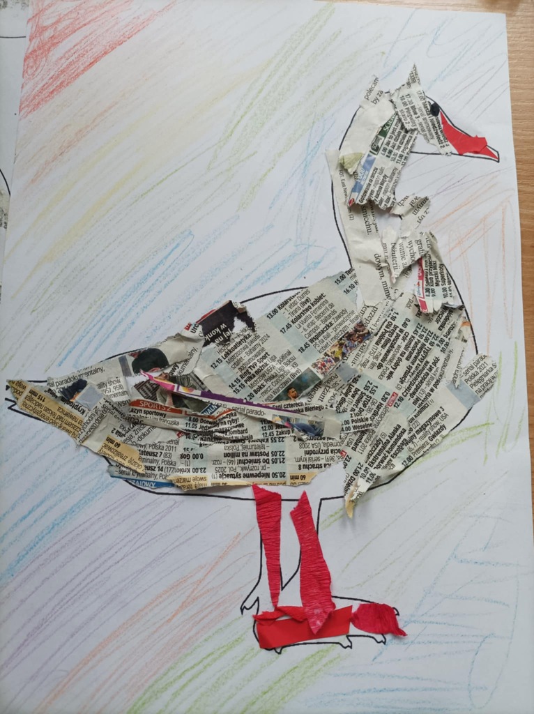 Dzieci wykonały ptaka wyklejanego z papieru i teczkę dla taty, w której schowane były ważne dla niego przedmioty.
