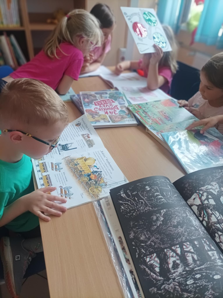 Dzieci oglądały różnorodne książki dostępne w naszej bibliotece. Duże zainteresowanie wzbudziły te, do których dołączone były specjalne okulary lub lupy, np.: „Co kryje las?” Ainy Bestard lub „Jaś Ciekawski: podróż przez dżunglę” Matthias’a Picarda.