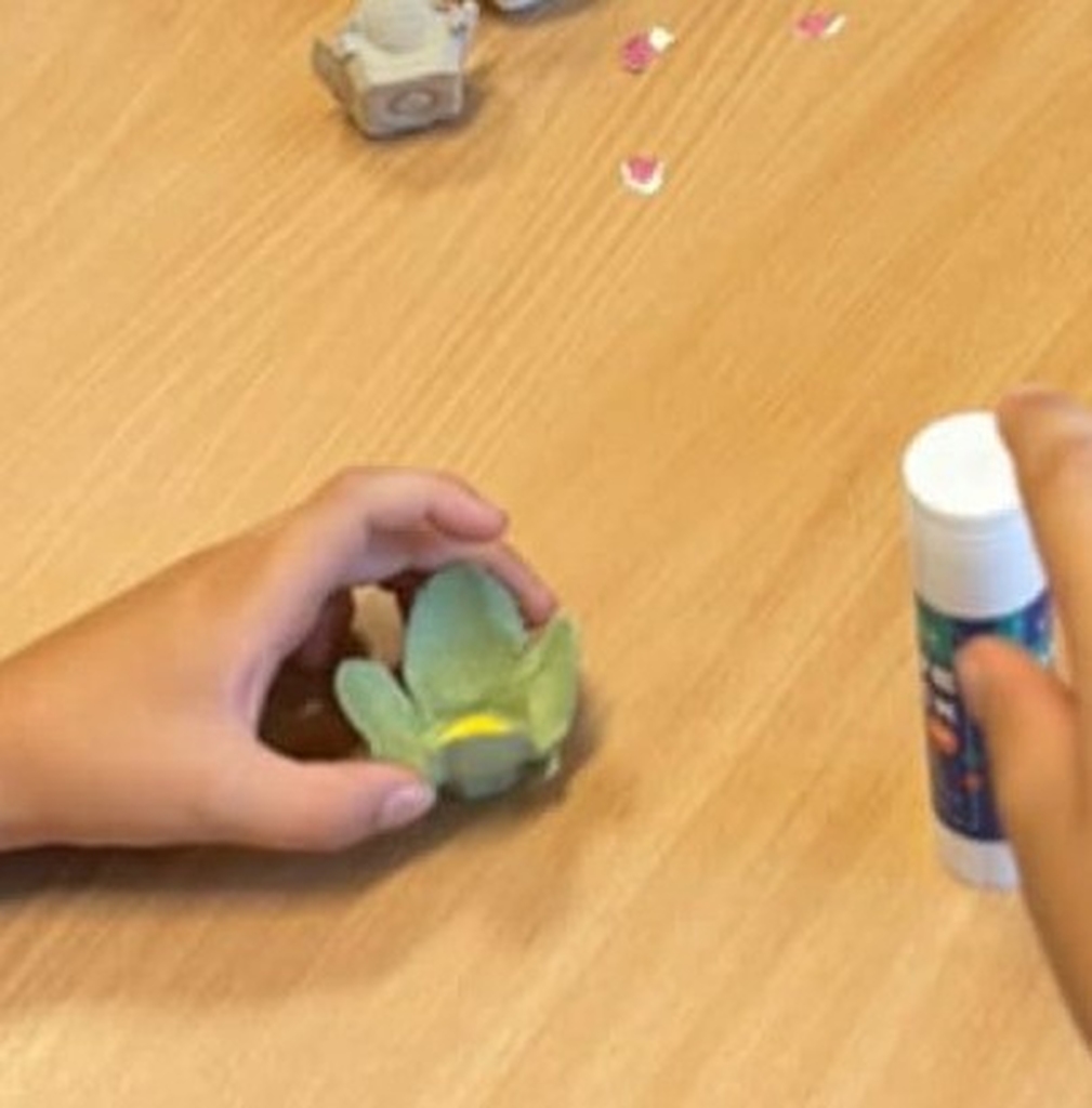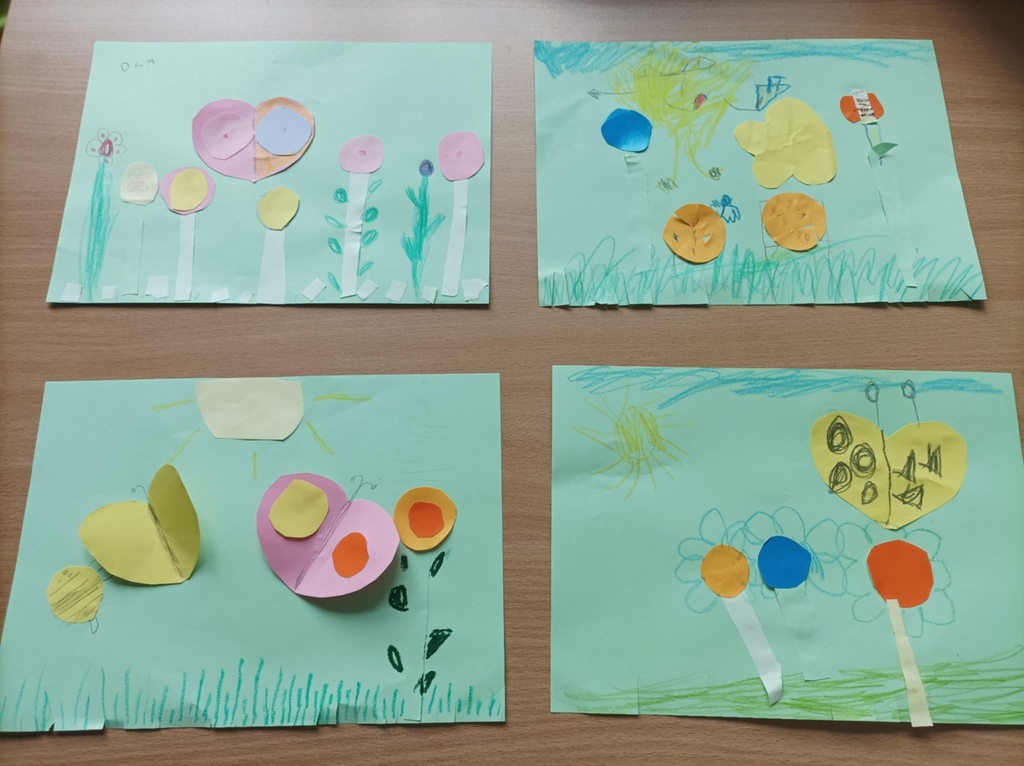 W kąciku aktywności plastycznych uczestnicy spotkań wykonali: kwiatka z wytłaczanki po jajkach, letnią łąkę z motylkami oraz książeczki z ilustrowaną przez siebie okładką (w przedszkolu dzieci z „Bajlandii” miały „gęsim” piórem, umoczonym w atramencie, napisać pierwszą literę swojego imienia na okładce książeczki).