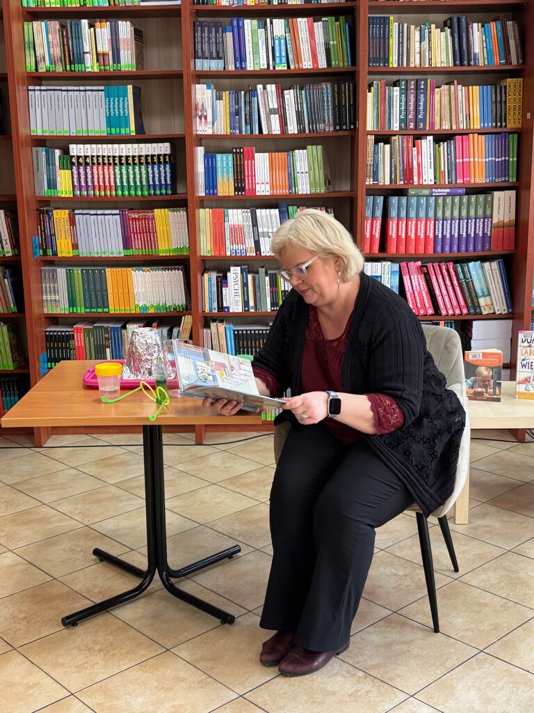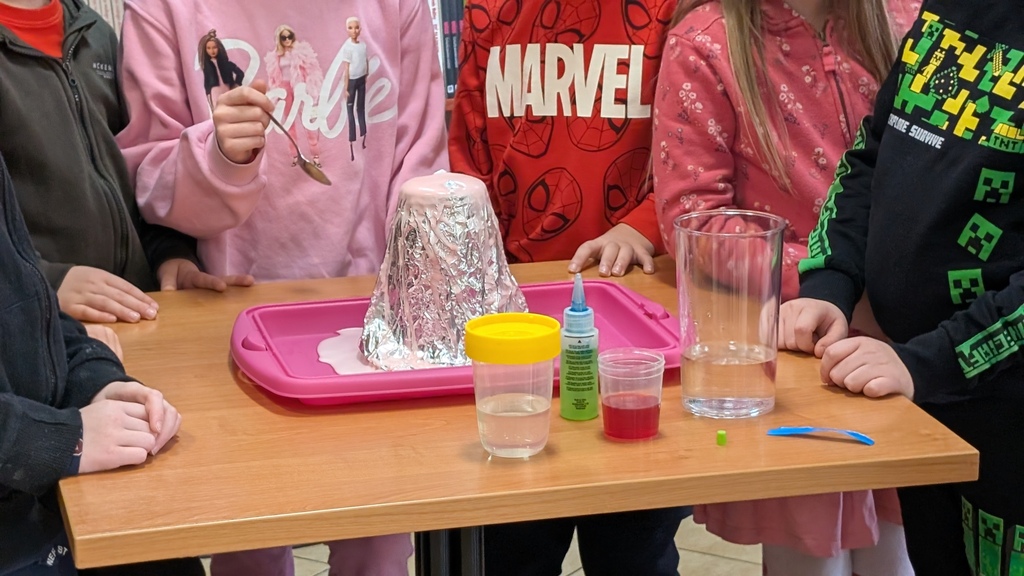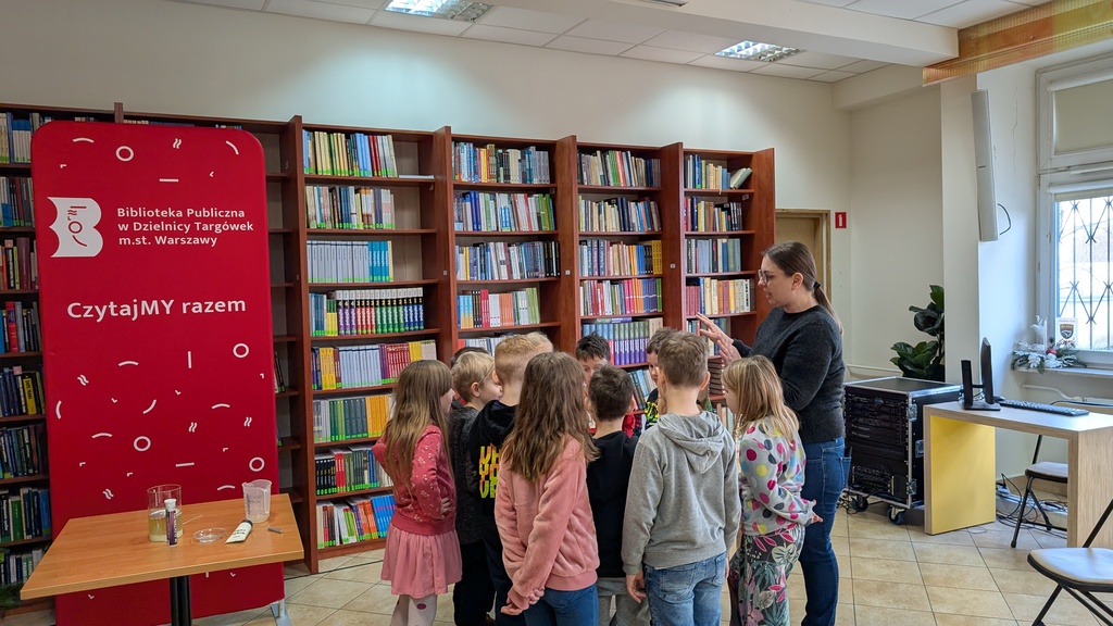 Po dodaniu do mikstury tajemniczego składnika nasi wspaniali goście (Szkoła Podstawowa nr 380 im. Jana Pawła II i Szkoła Podstawowa nr 114 w Warszawie) obserwowali, jak drobinki lśniącego magicznego pyłu burzliwie wirują jak płatki śniegu. Bajeczny widok! Ale… to był dopiero początek. Chwilę później w Czytelni Naukowej nr I im. Janiny Englert nastąpiła erupcja wulkanu! 💥 Po wymieszaniu najrozmaitszych składników popłynęła kolorowa lawa.