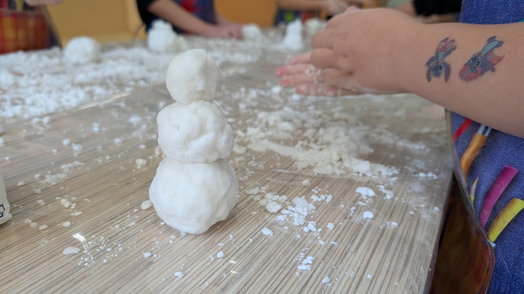 Na deser ponownie pomogliśmy zimie. Mali czarodzieje stworzyli… śnieg! ❄️ Kreatywności nie było końca. Podziwialiśmy arcydzieła: bałwanki, kotki, pieski, miniwulkany, slimy, kule śnieżne i wiele innych cudowności. ⛄️